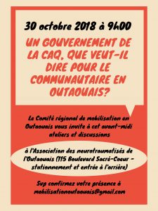Mardi le 30 octobre aura lieu une rencontre très spéciale du Comité régional de mobilisation en Outaouais de 9h00 à 12h00 à l’Association des neurotraumatisés de l’Outaouais (ANO) au 115 Boulevard Sacré-Cœur (Secteur Hull) Stationnements et entrée à l’arrière.